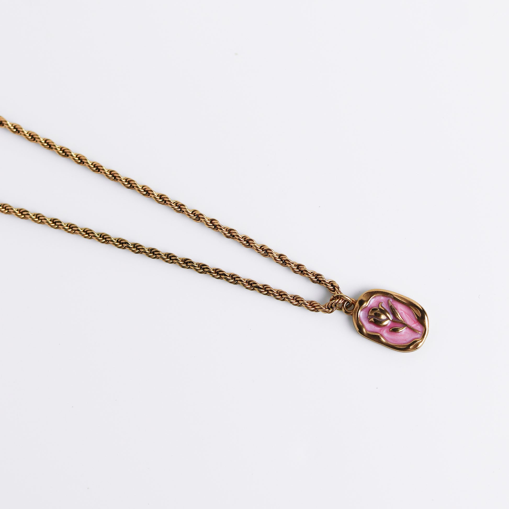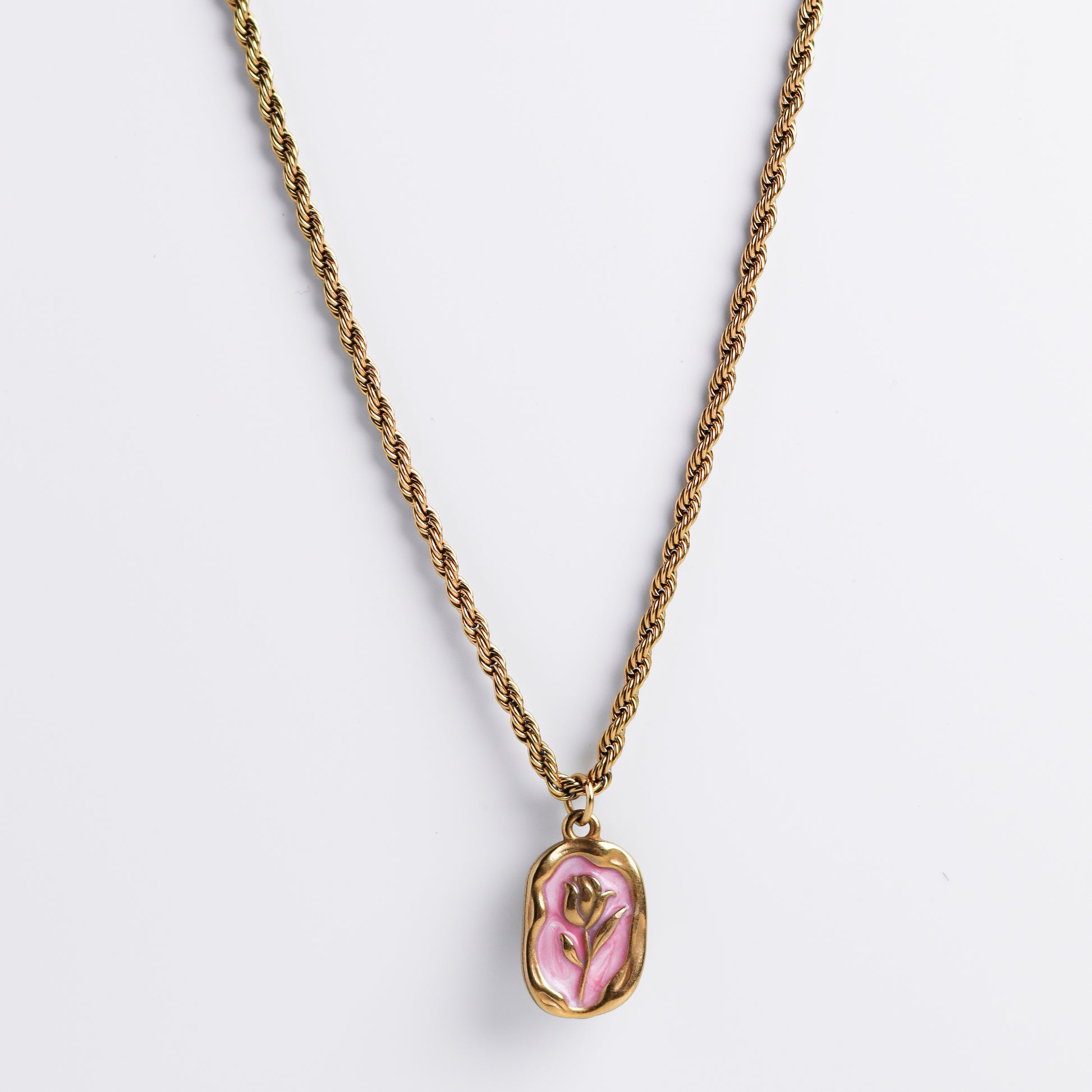 La collana "Irina" è un omaggio alla bellezza delicata e senza tempo. Il ciondolo raffigurante una rosa stilizzata su sfondo rosa smaltato si combina con una catena intrecciata che aggiunge un tocco di raffinatezza artigianale. Perfetta per chi ama gli accessori romantici e sofisticati, "Ariana" si adatta a ogni stile e occasione.