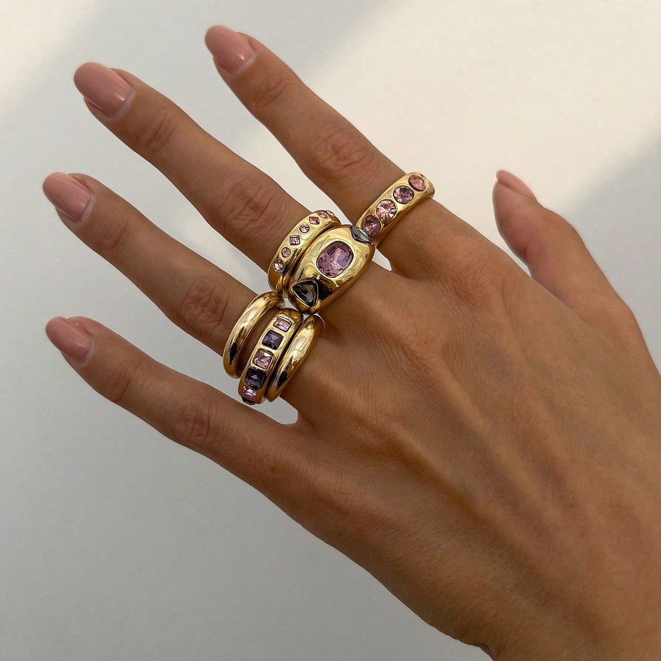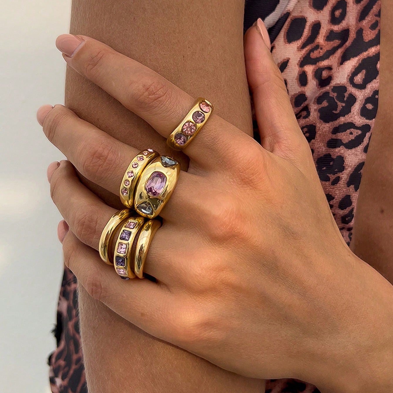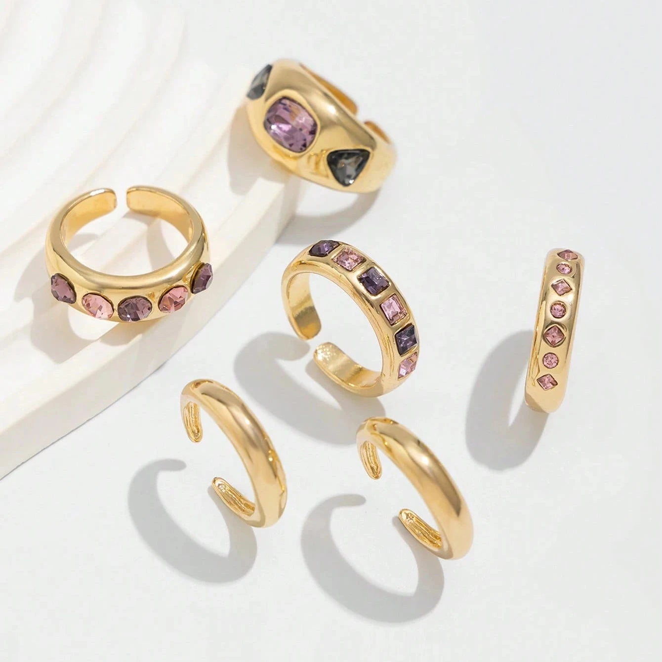 Il Blush Dream Set è composto da 6 anelli regolabili dal design bold e luminoso, impreziositi da strass rosa e lilla che catturano la luce a ogni movimento.