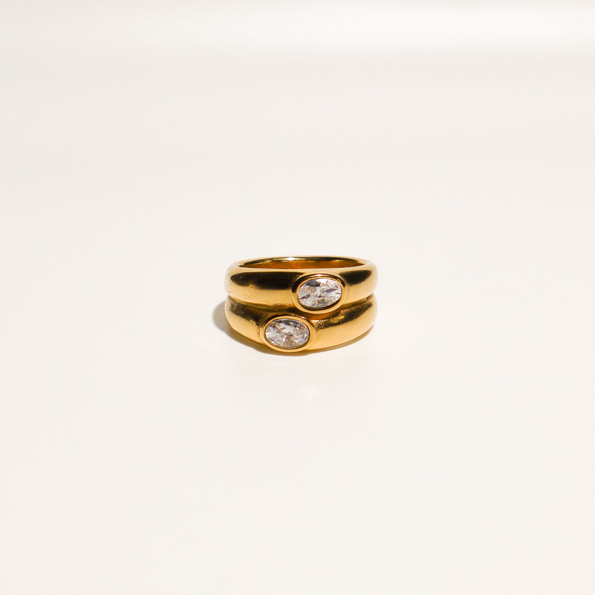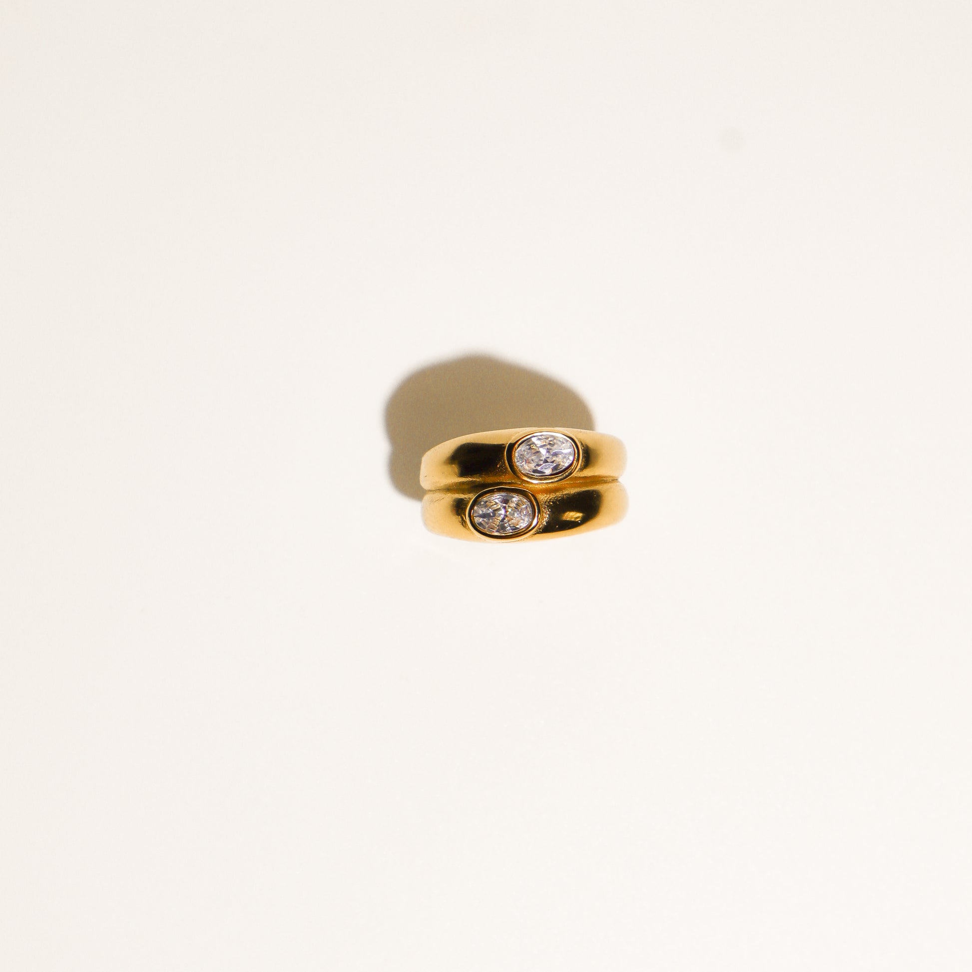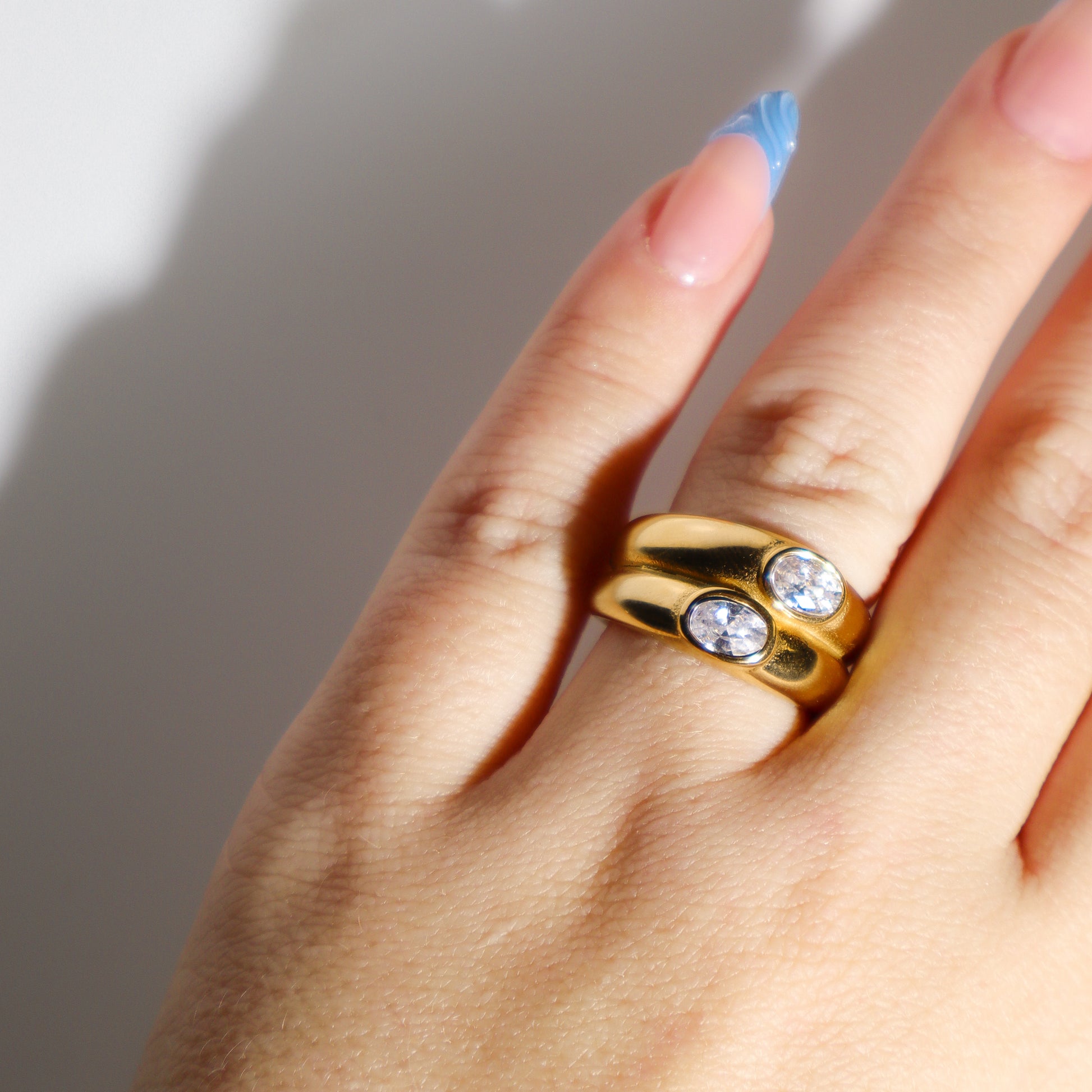 Eterna è l’anello che cattura la luce da ogni angolazione, grazie alle sue due zirconie cubiche incastonate su una doppia fascia dorata.