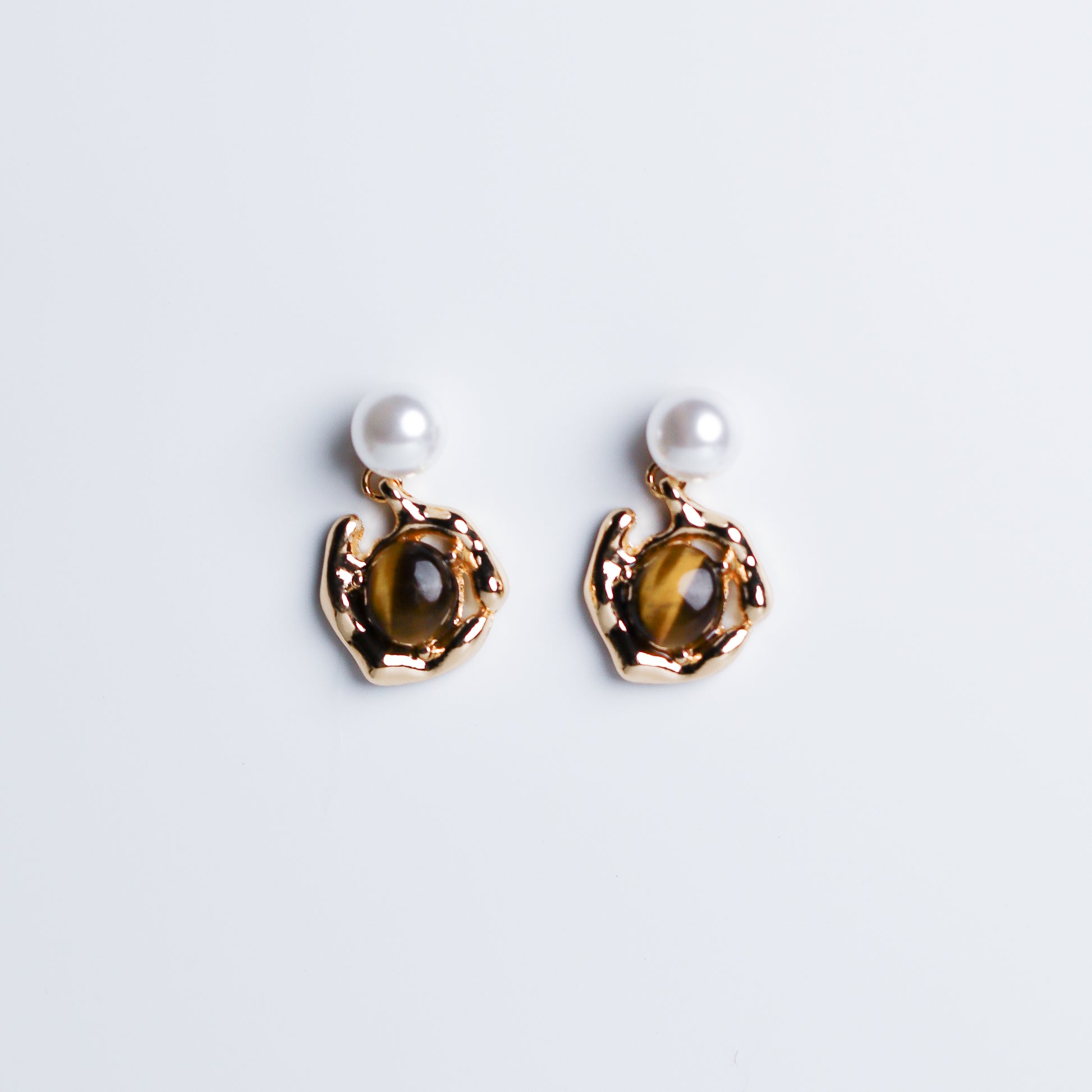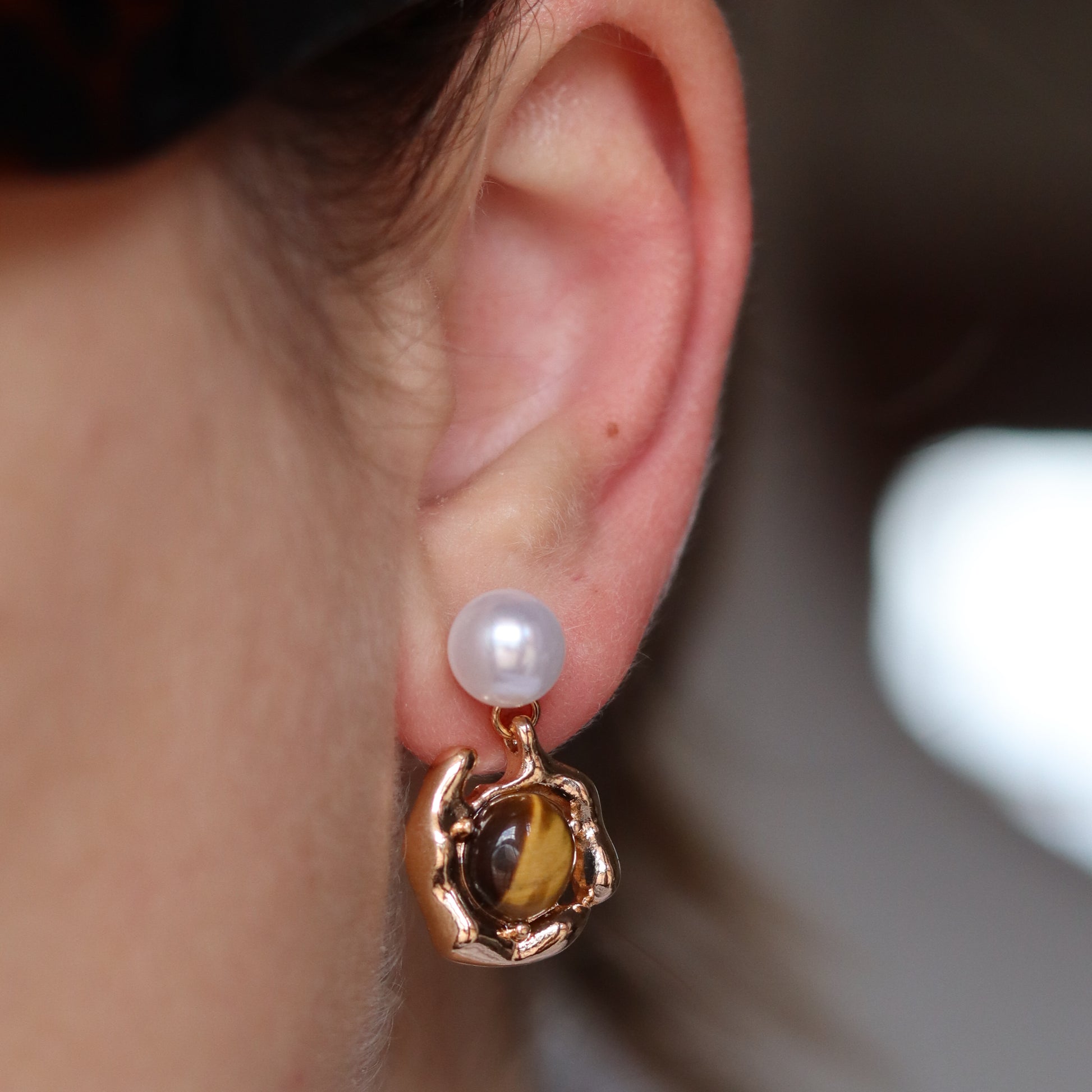 Un’eleganza senza tempo si fonde con dettagli sofisticati in questi orecchini ispirati alla bellezza e al mistero della notte. La perla luminosa, simbolo di purezza e raffinatezza, si abbina perfettamente alla montatura dorata dal design irregolare che custodisce una pietra dal colore caldo e intenso, richiamando il fascino della luna che illumina il cielo.