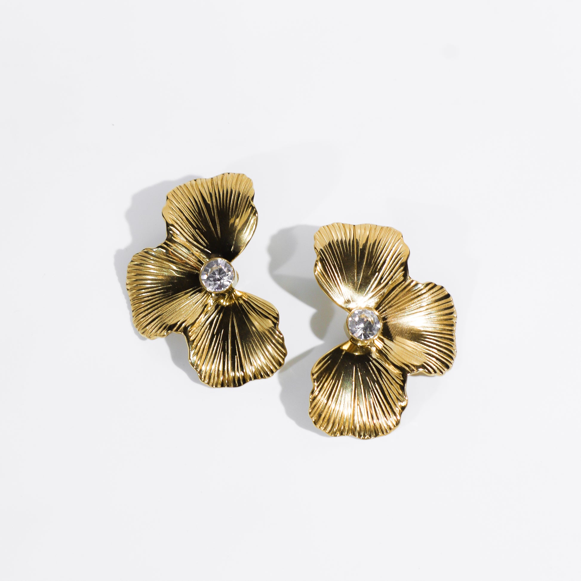Un incontro tra natura e luce celeste: gli orecchini Luna Blossom si ispirano alla delicatezza di un fiore notturno colto sotto il chiaro di luna. Le tre petali finemente incisi in metallo dorato si aprono attorno a un luminoso cristallo centrale, catturando lo sguardo con eleganza e poesia.