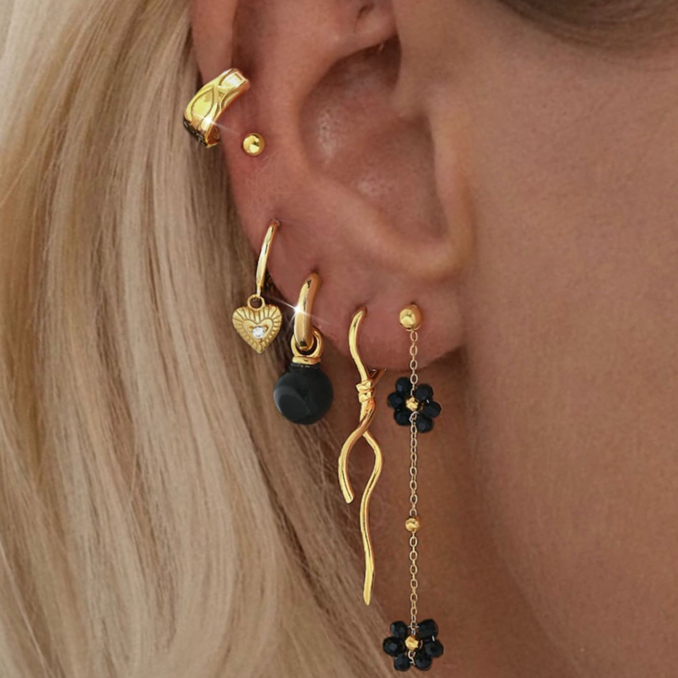 Ogni dettaglio è un piccolo statement: dal cuore con punto luce alla pietra nera, dalle forme sinuose alla catena floreale che scende delicatamente lungo l’orecchio.