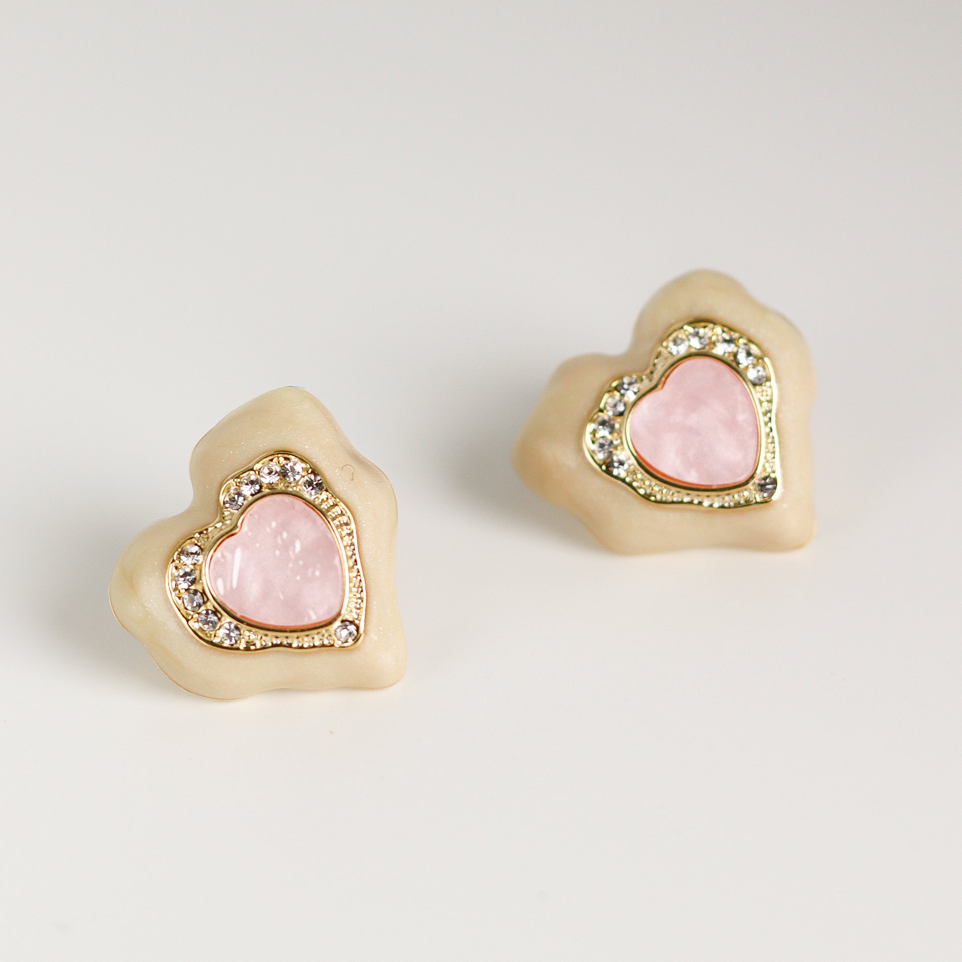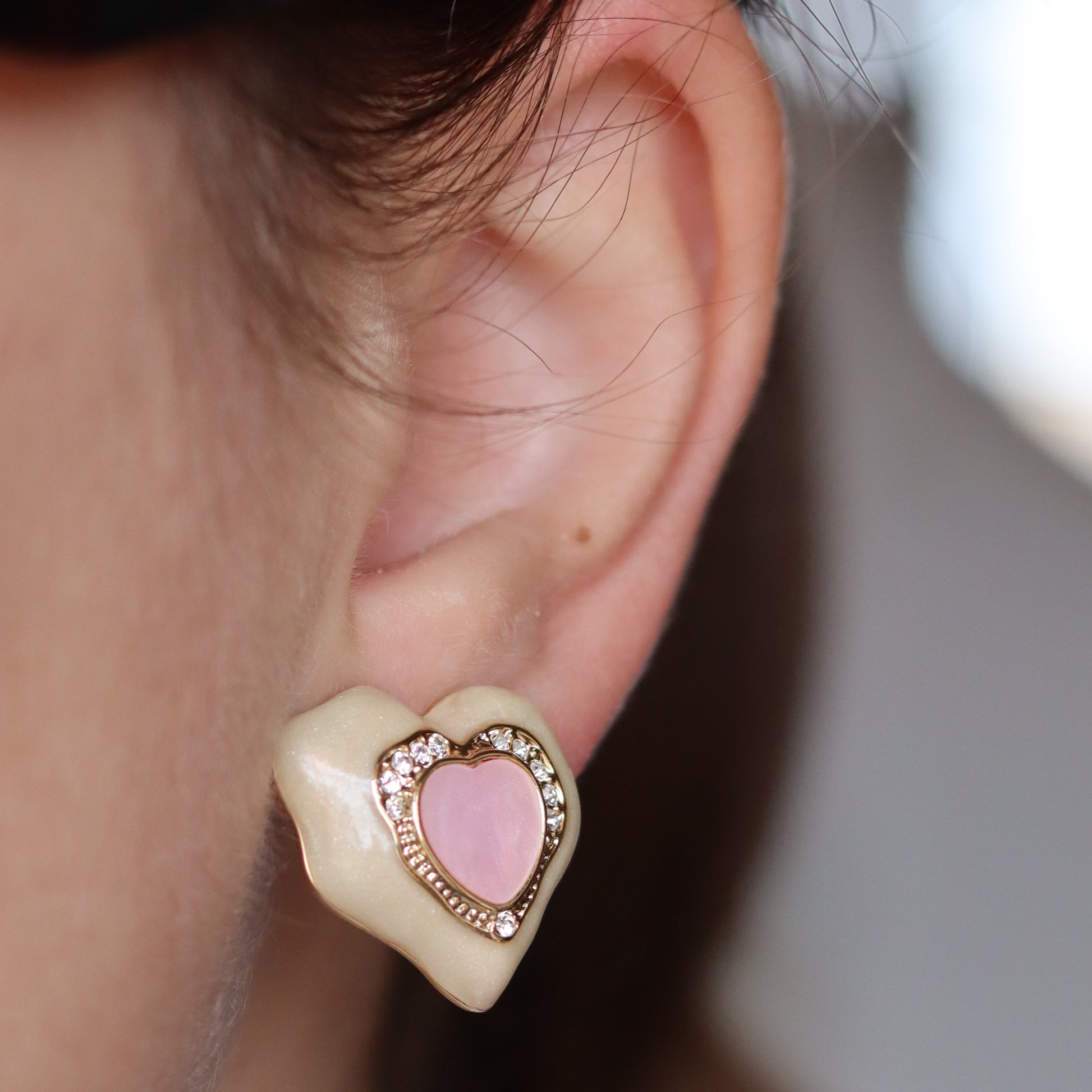 Questi orecchini incapsulano l’essenza del romanticismo senza tempo. Realizzati con una delicata finitura madreperla rosa a forma di cuore, incorniciata da cristalli scintillanti, evocano eleganza e dolcezza. Il loro design è un perfetto equilibrio tra vintage e moderno, ideale per chi ama i dettagli raffinati che non passano inosservati.