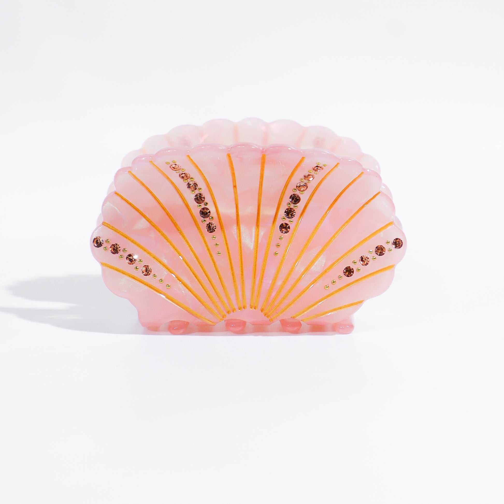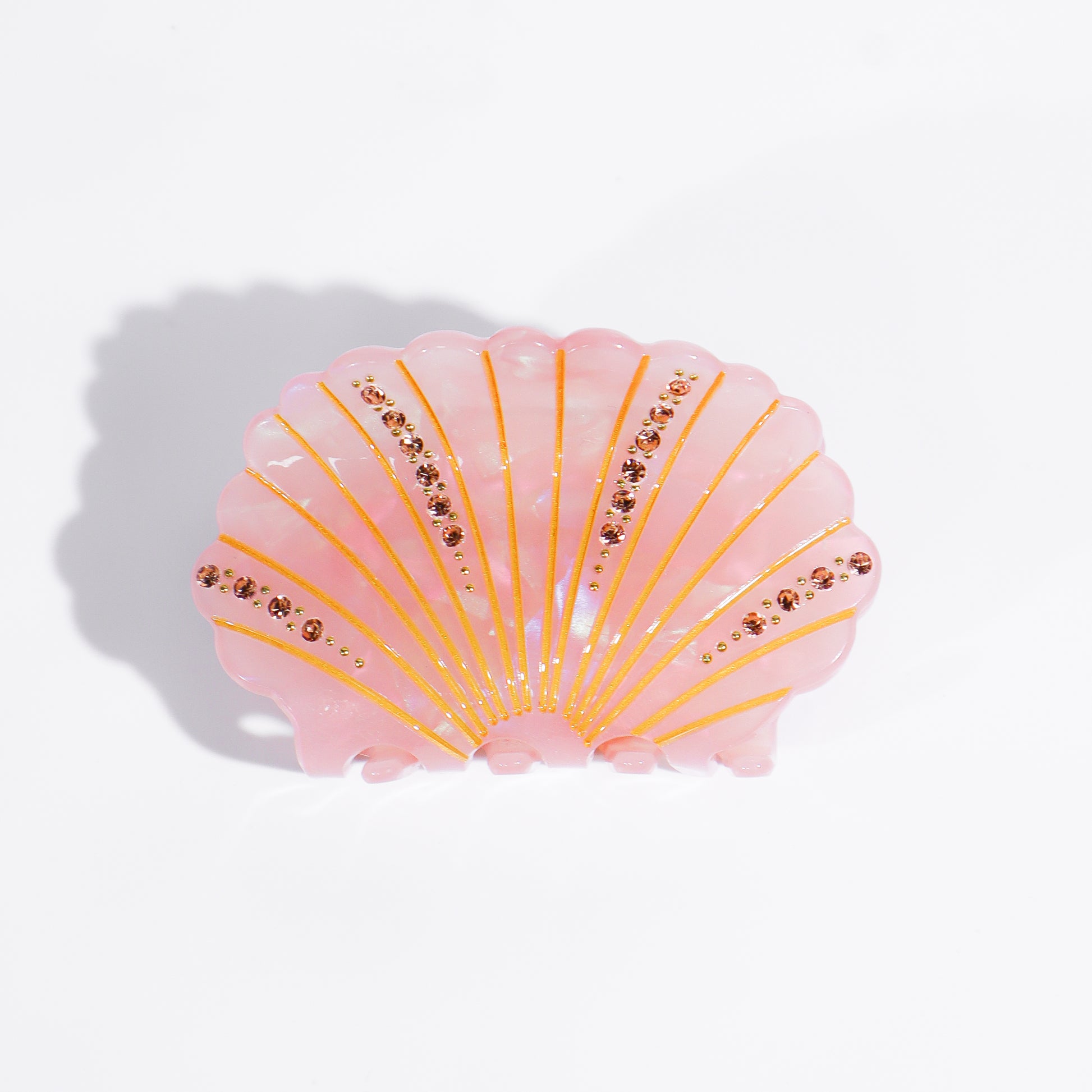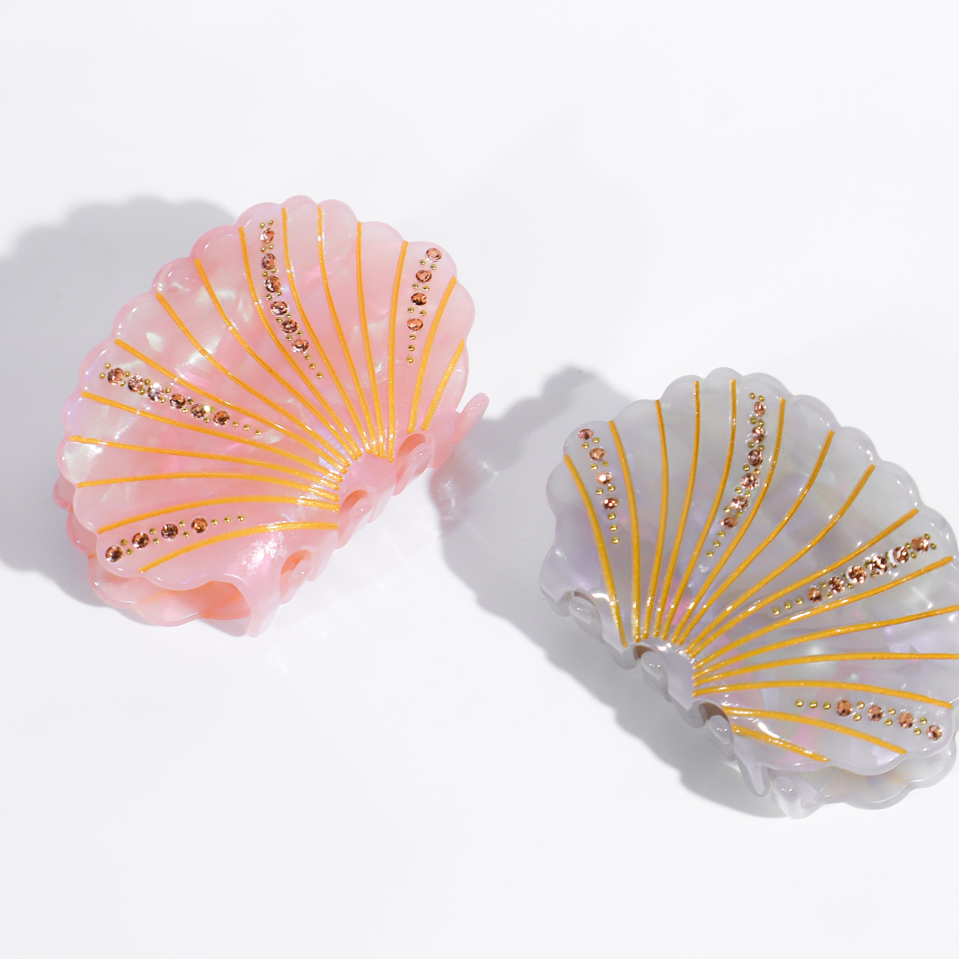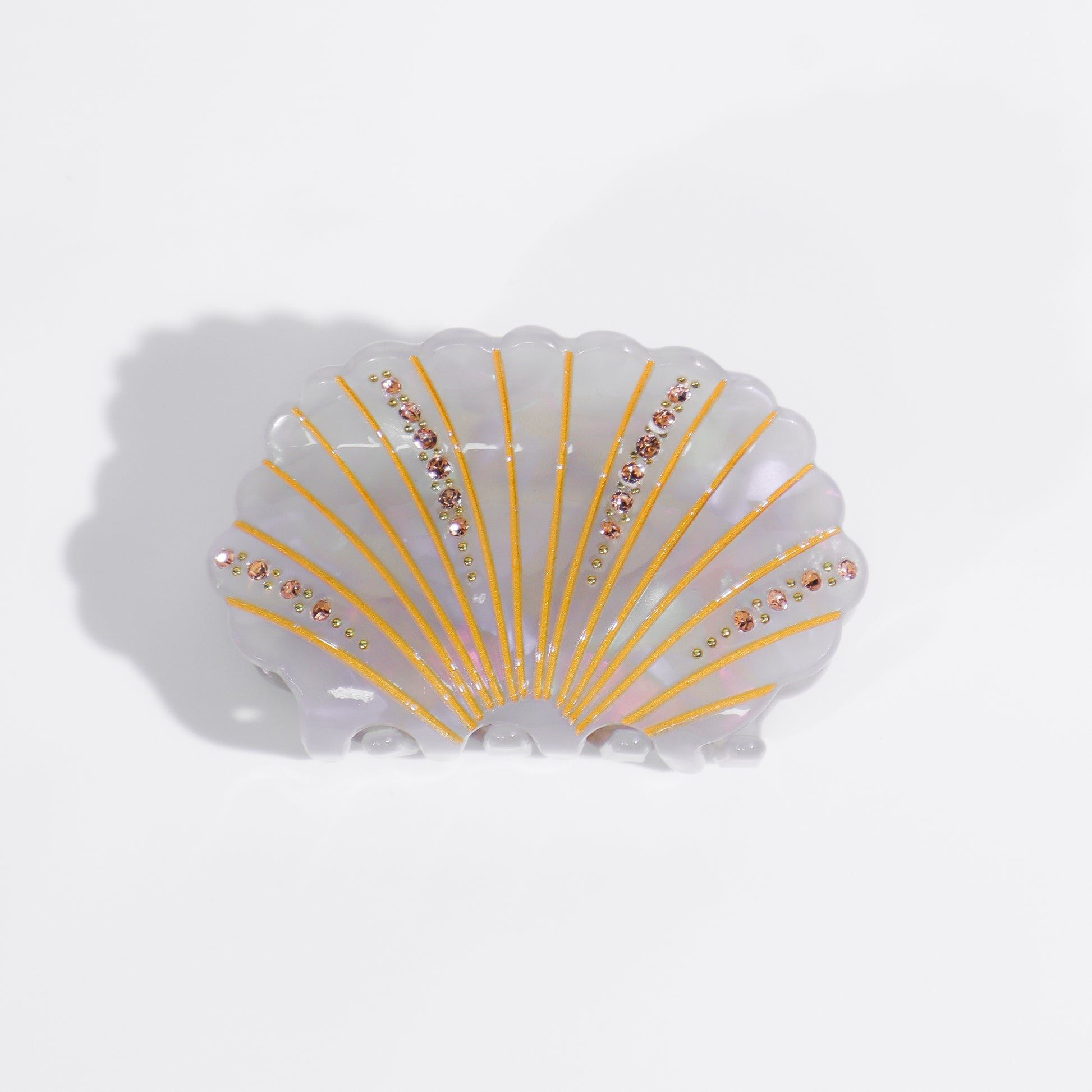 Romantica e scintillante, Shellie è la clip a forma di conchiglia che porta con sé tutta la magia del mare. Realizzata in resina effetto madreperla, è impreziosita da delicati strass e finiture dorate che catturano la luce con ogni movimento. Disponibile in due varianti incantevoli — rosa corallo e grigio perla — Shellie è perfetta per aggiungere un tocco elegante e sognante al tuo hairstyle.