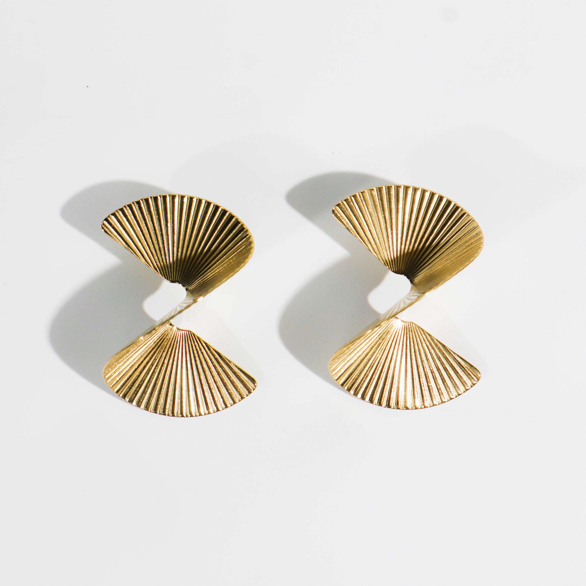 Gli orecchini "Spiral" sono un’elegante celebrazione del movimento e della forma. Realizzati in metallo dorato, presentano una doppia ventaglio che si avvolge con grazia intorno a un asse centrale, creando un raffinato effetto a spirale. Le linee incise sulla superficie enfatizzano il gioco di luci e ombre, donando profondità e dinamismo al design. Leggeri e sofisticati, gli orecchini "Spiral" sono l'accessorio perfetto per aggiungere un tocco di arte scultorea a qualsiasi look.